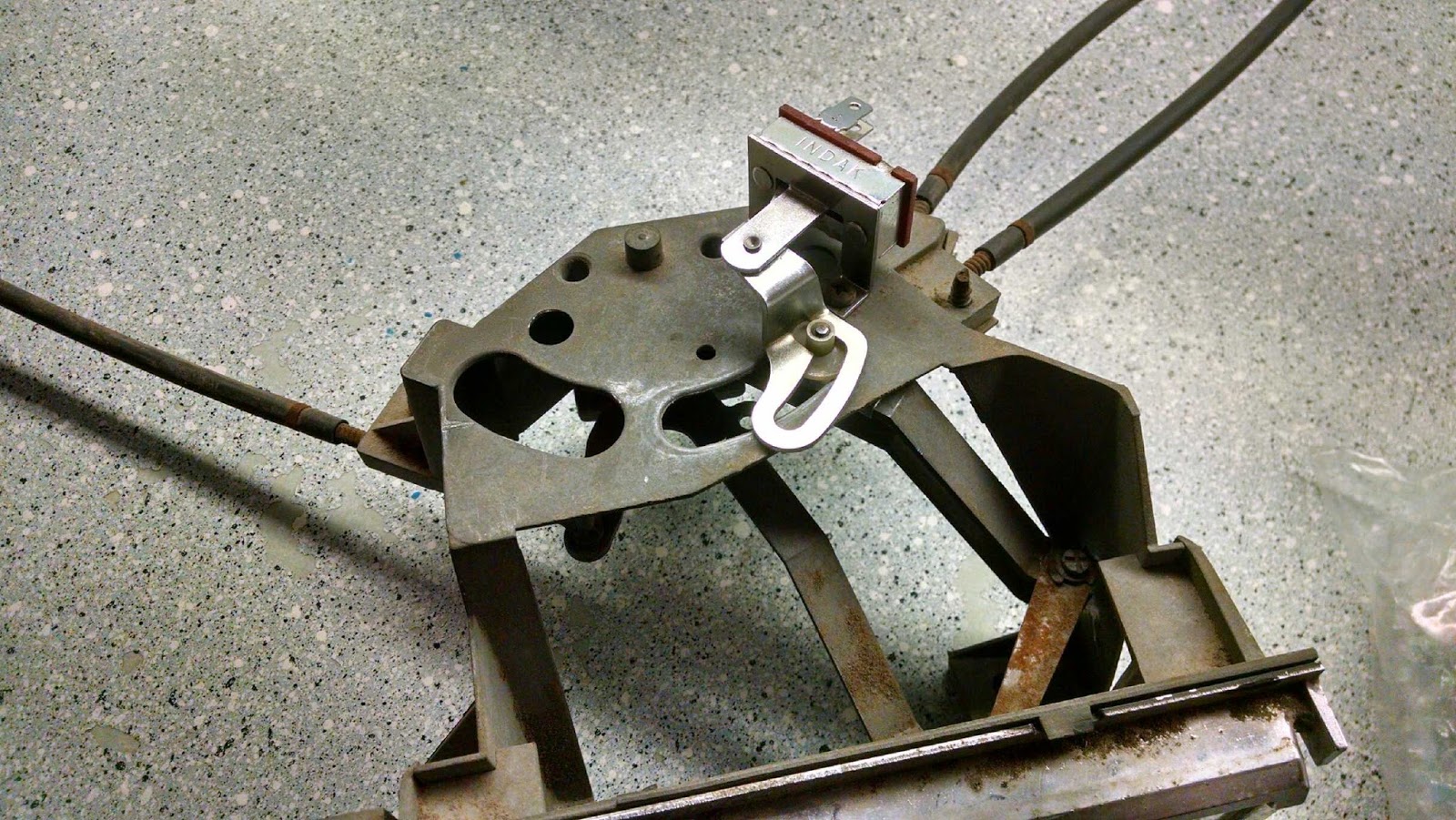 And the next photo was taken from under the car, looking up to show where the cable then passes back through the firewall and bolts to the engine using one of the bellhousing mounting bolts.