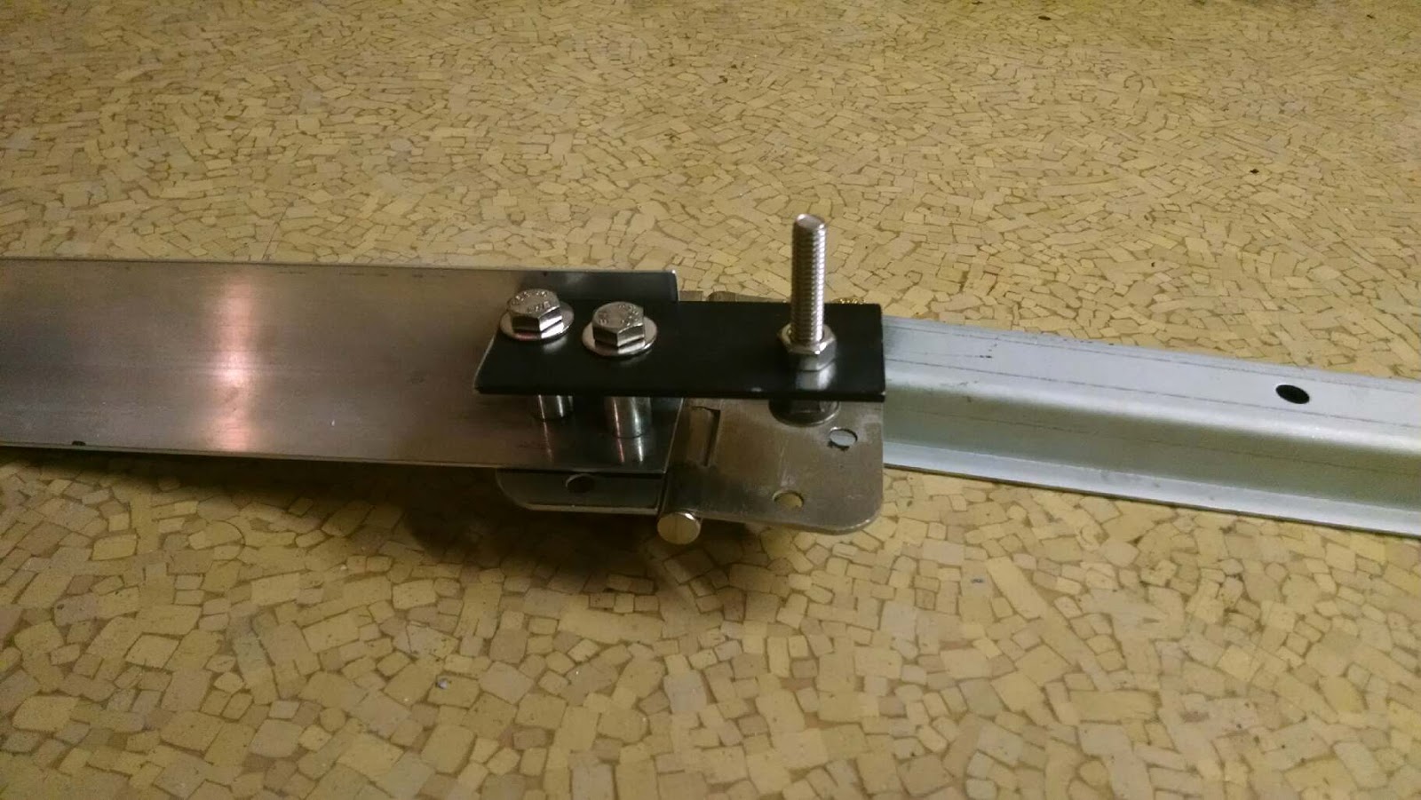 By carefully aligning all these parts the same way each time, you can reproduce identical bends consistently. The last thing to take care of is the angle of the bend, and that's what the carriage bolt is for. The carriage bolt is an adjustable stop, so that you just bend the hinge until it contacts the head of the carriage bolt.